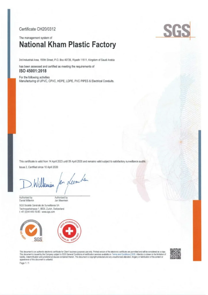 "ISO 45001:2018 Certificate for Occupational Health and Safety Management System"